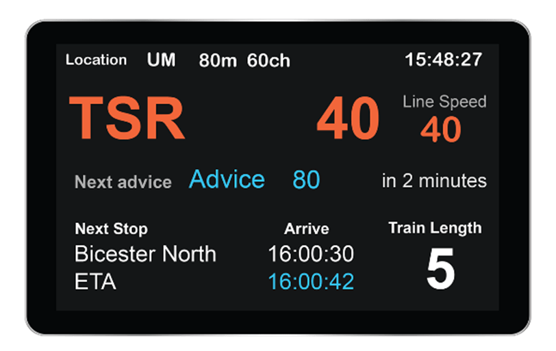 In this example, the DAS screen alerts the driver about a current Temporary Speed Restriction (TSR) and recommends a speed of 40mph, with an increase to 80mph expected in two minutes after the train has cleared the TSR zone.